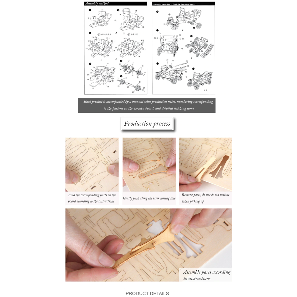 Alle houten onderdelen zijn gemaakt van multiplex, laser gesneden en makkelijk uit het bord te drukken.