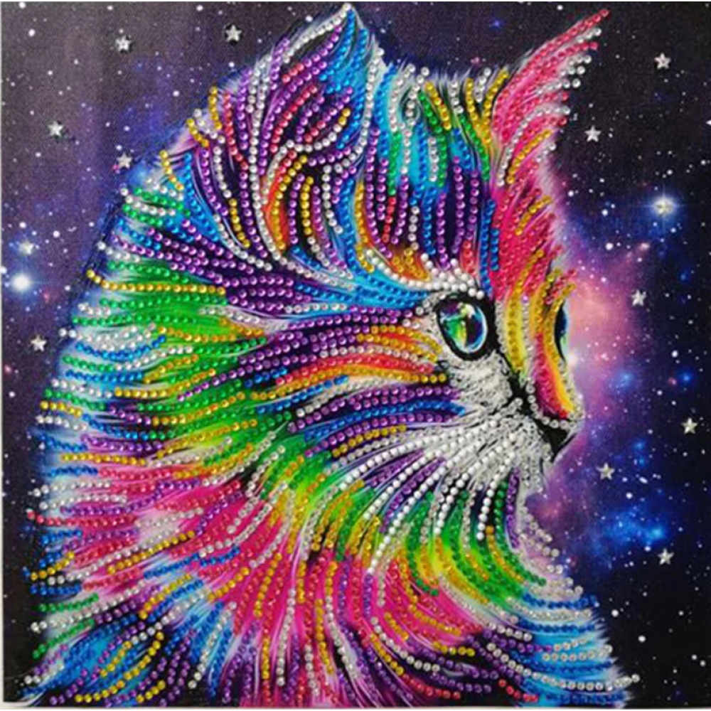 Een waterdicht canvas met daarop een patroon van de vrolijk gekleurde kat. Het canvas heeft een sterk plakkende film voor het bevestigen van de diamanten. Duidelijk en goed te lezen symbolen om de juist diamanten op het canvas te plakken.