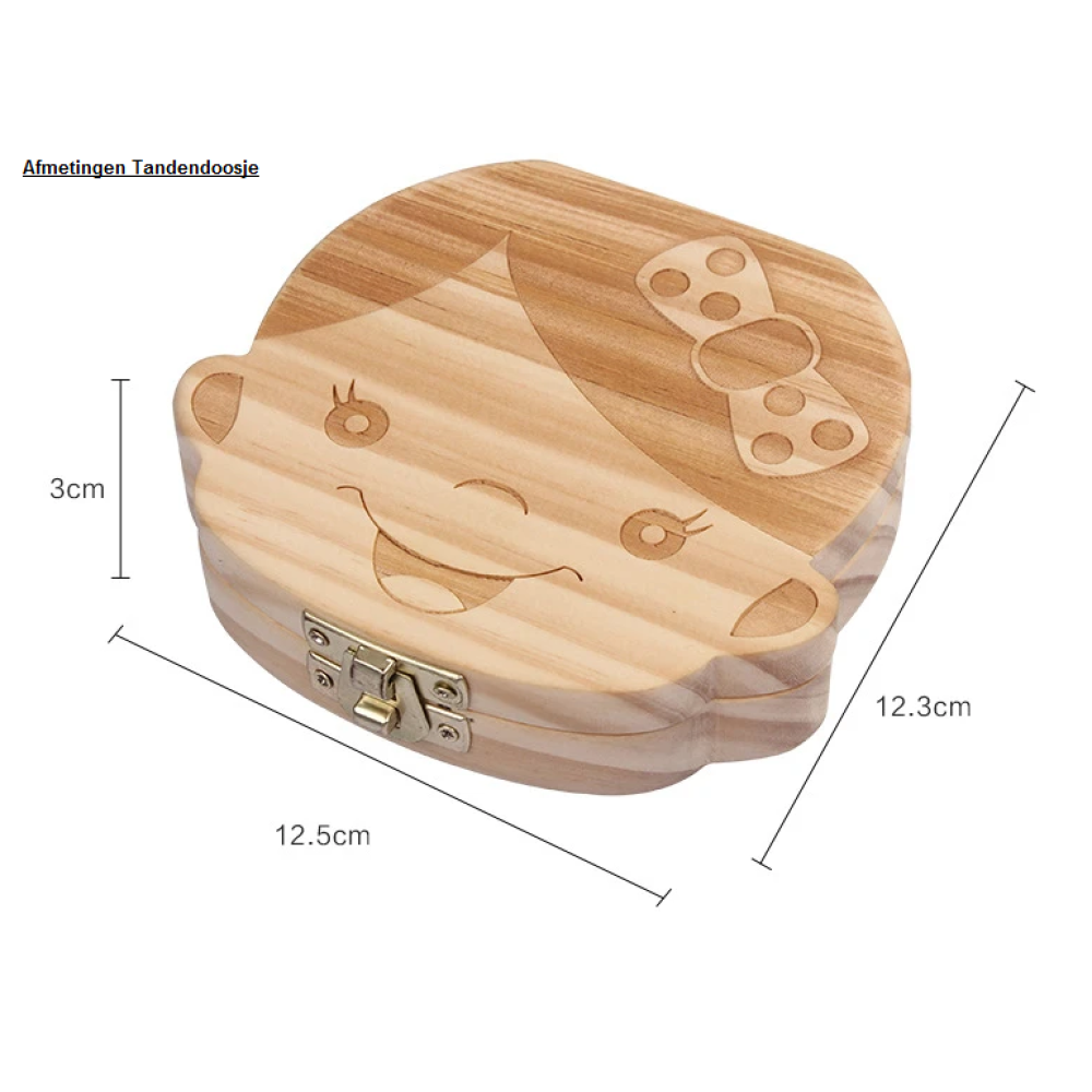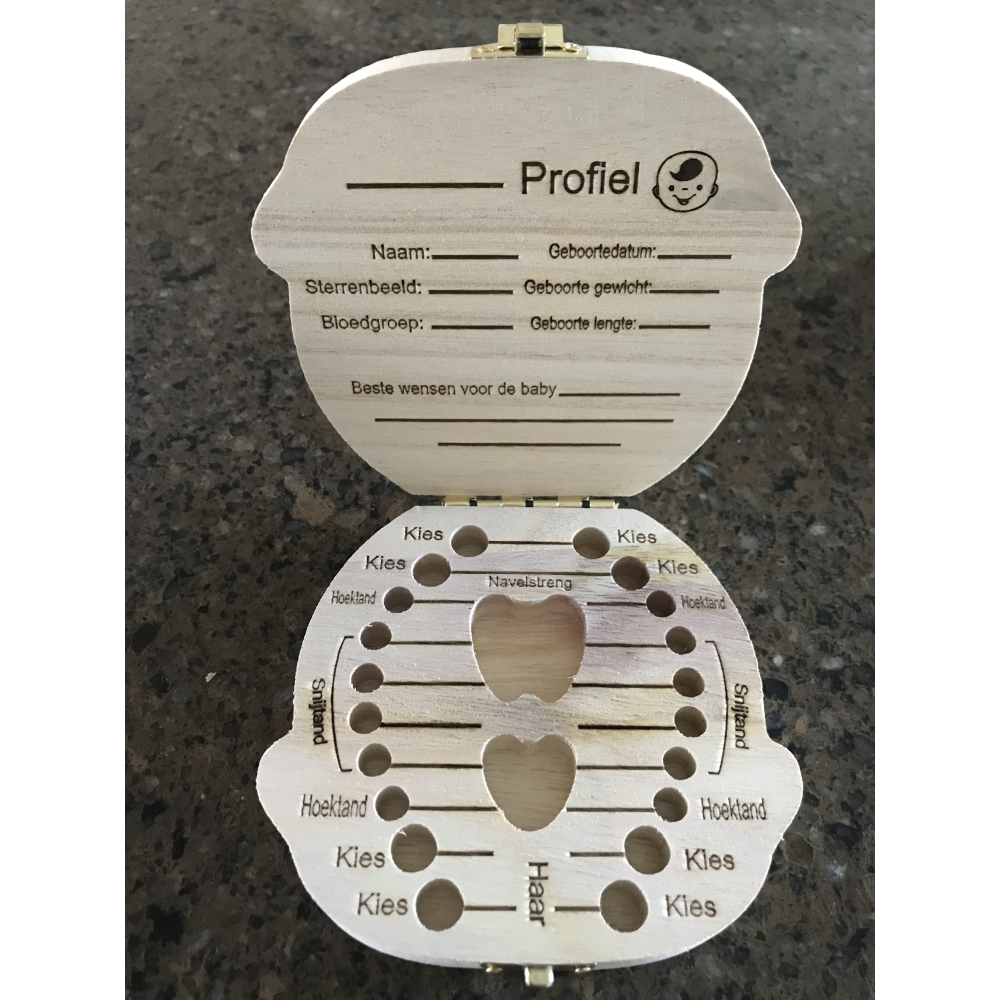 Duurzaam opberg doosje met solide sluiting voor het opbergen van de melktanden van het kind, ook ruimte voor stukje haar en navelstreng.