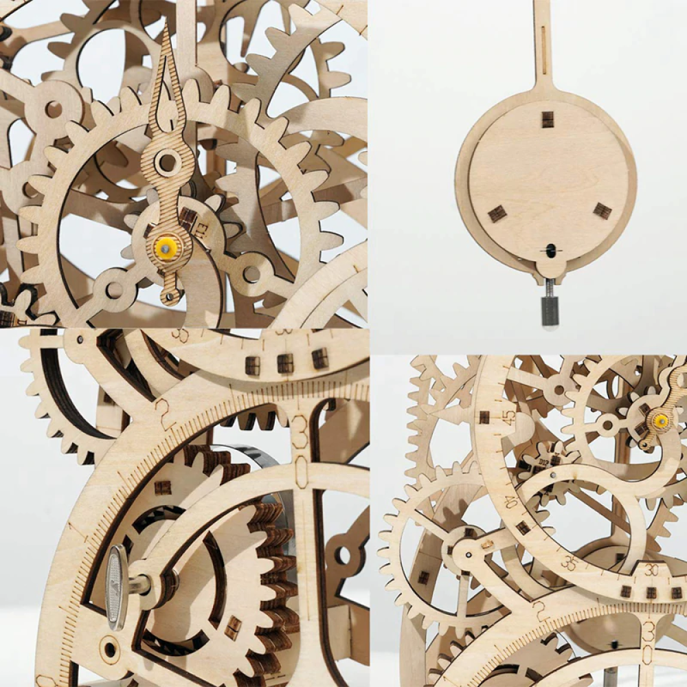 De klok kan opgewonden worden met een sleutel zodat de onderdelen gaan bewegen!