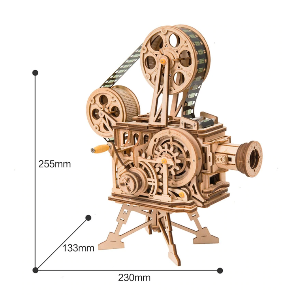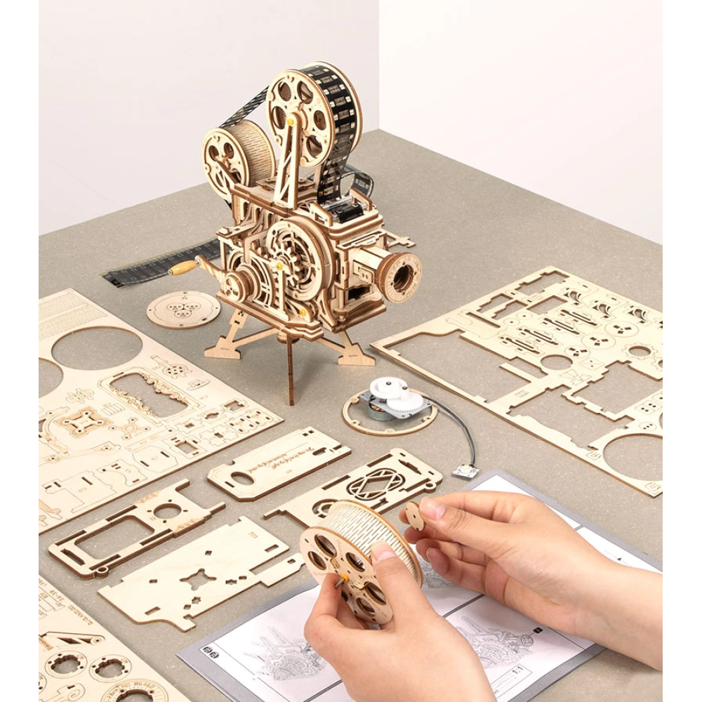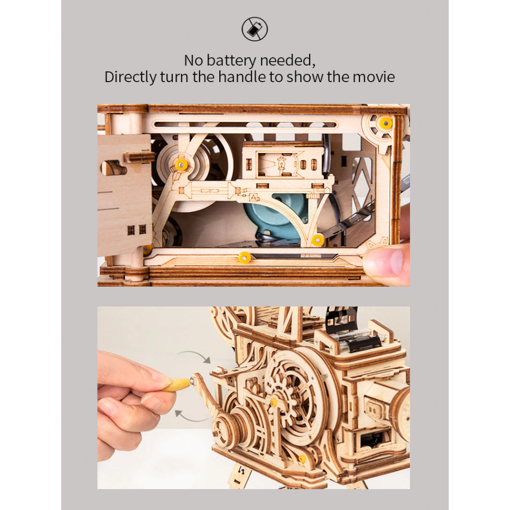 De projector kan de (bijgeleverde) film afspelen door aan de hendels te draaien! Op een afstand van 30cm tot het doek heb je je eigen bioscooop!