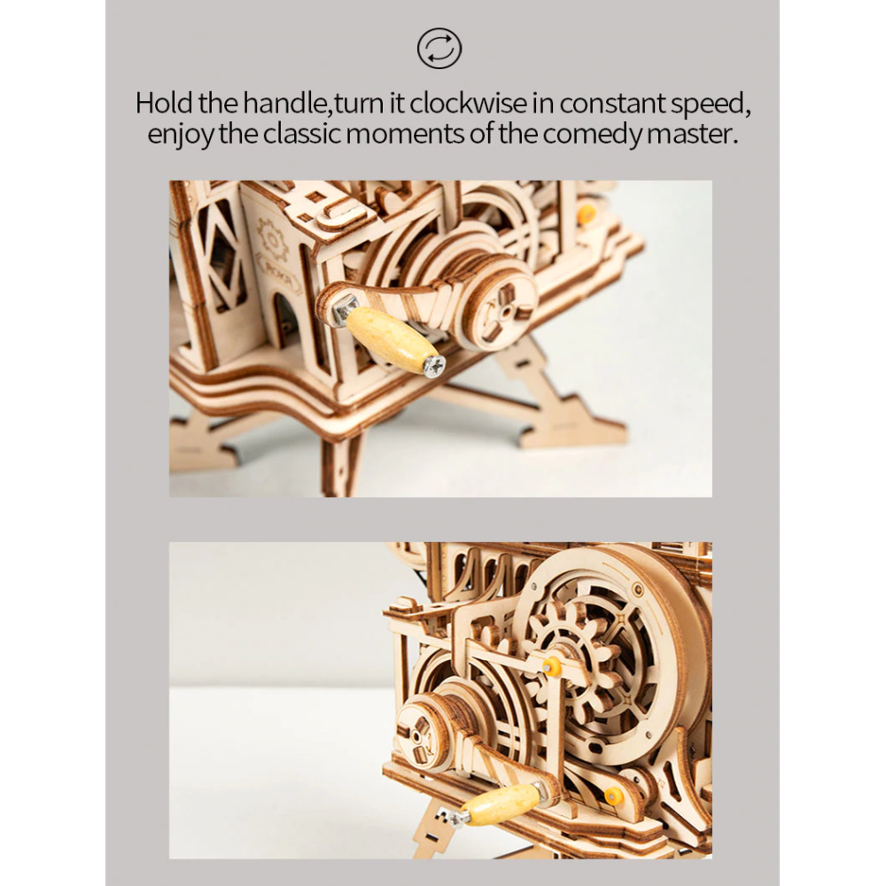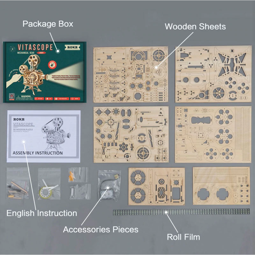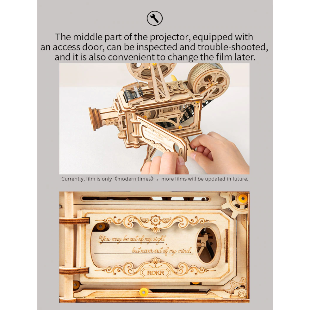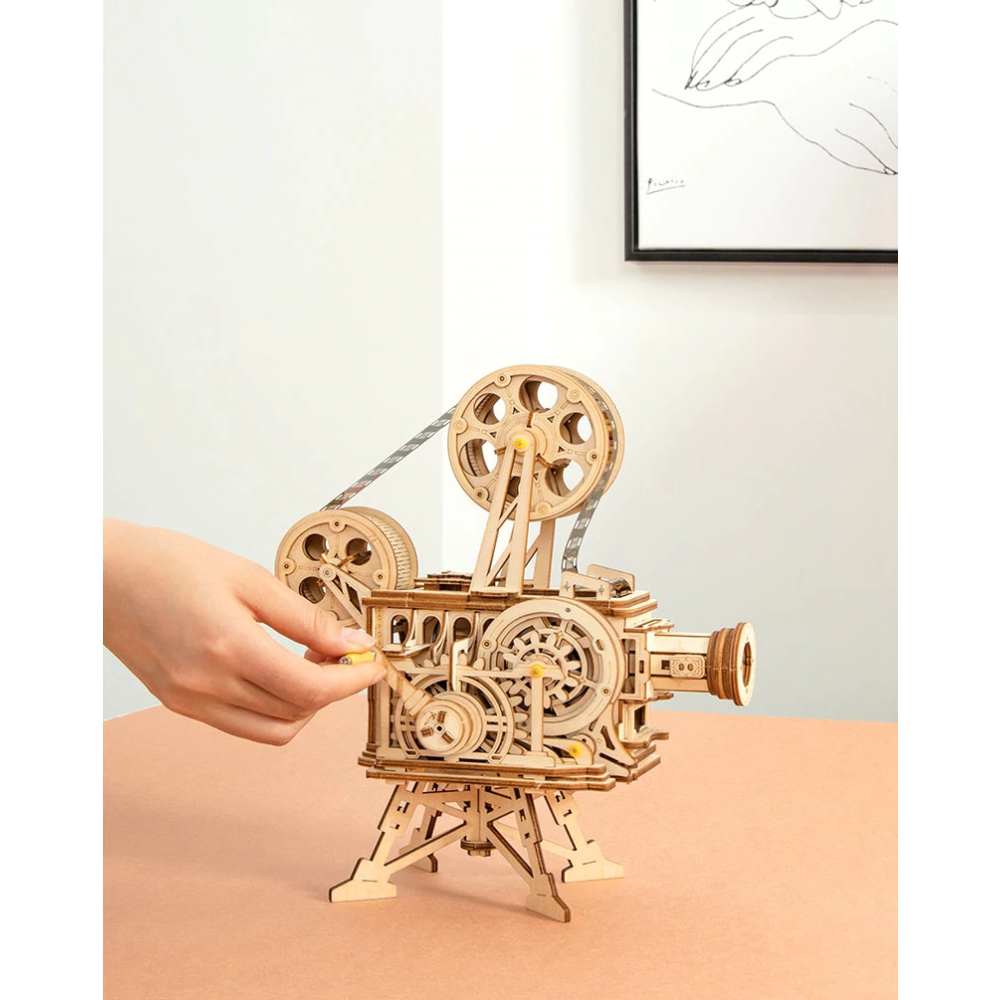 De projector kan de (bijgeleverde) film afspelen door aan de hendels te draaien! Op een afstand van 30cm tot het doek heb je je eigen bioscooop!