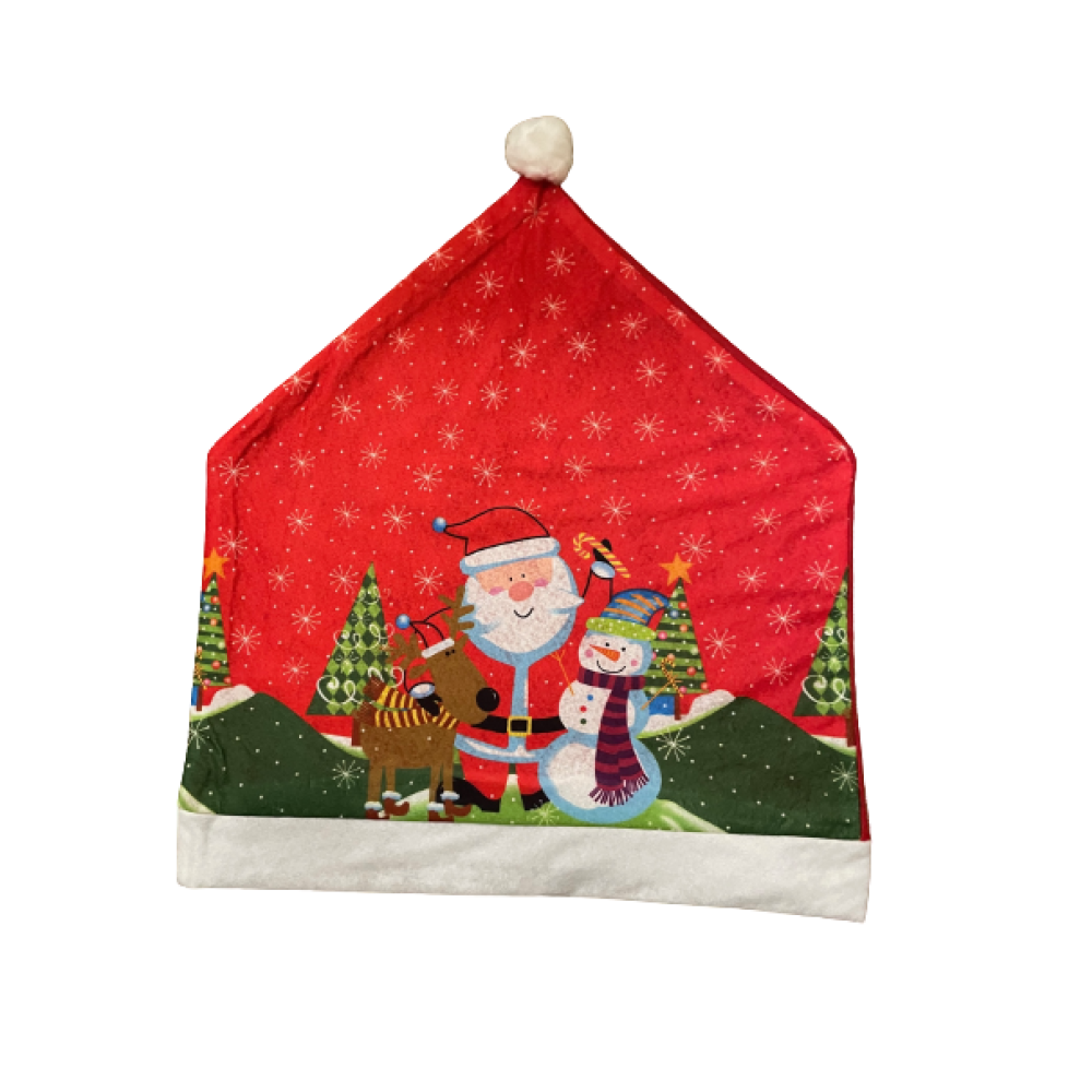 Doordat de punten van de hoezen naar beneden hangen lijkt het net of elke stoel een kerstmuts op heeft.