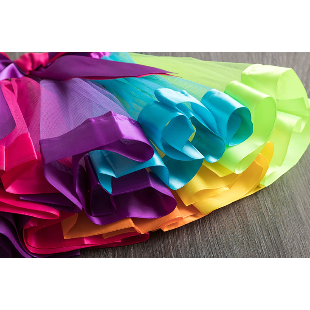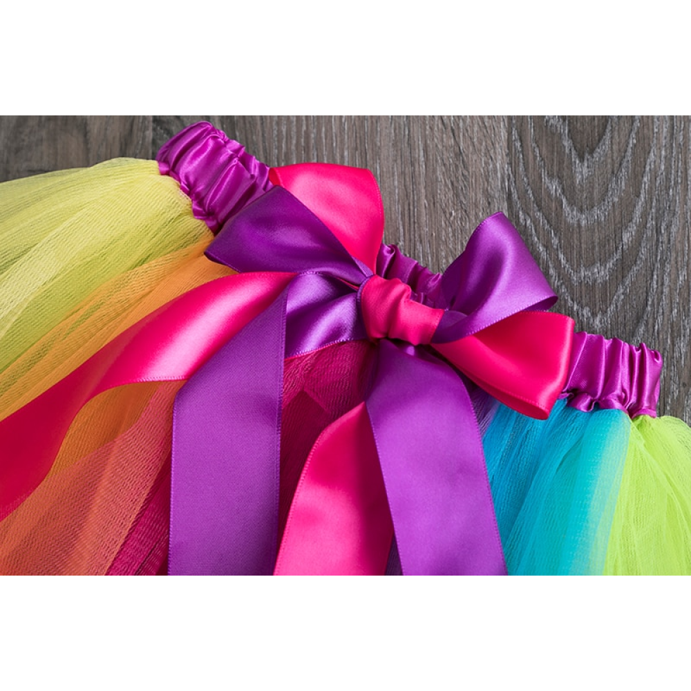 • Rok is gemaakt van losse stroken tule in felle kleuren,