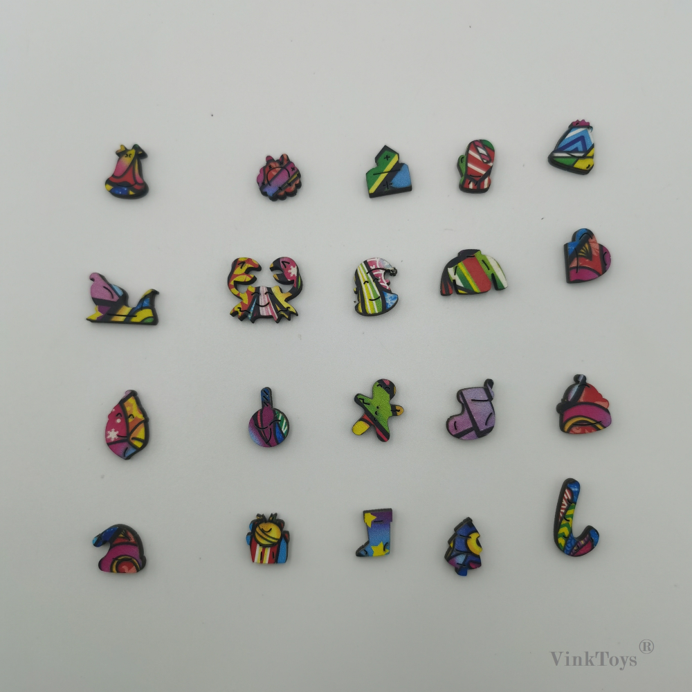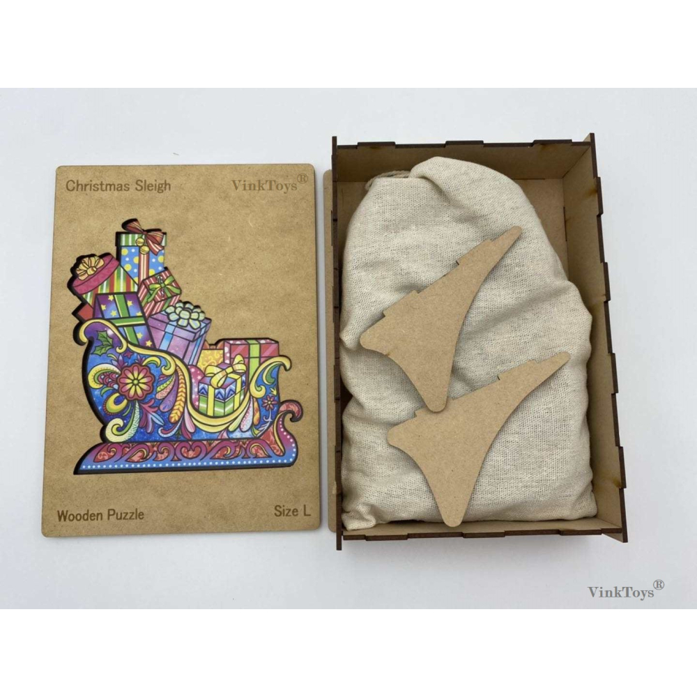 Zoek alle puzzelstukjes bij elkaar en vorm samen deze arreslee van de kerstman volgepakt met cadeautjes! Vind de kerstsok, kerstboom, trui, handschoen, klok en nog veel meer!